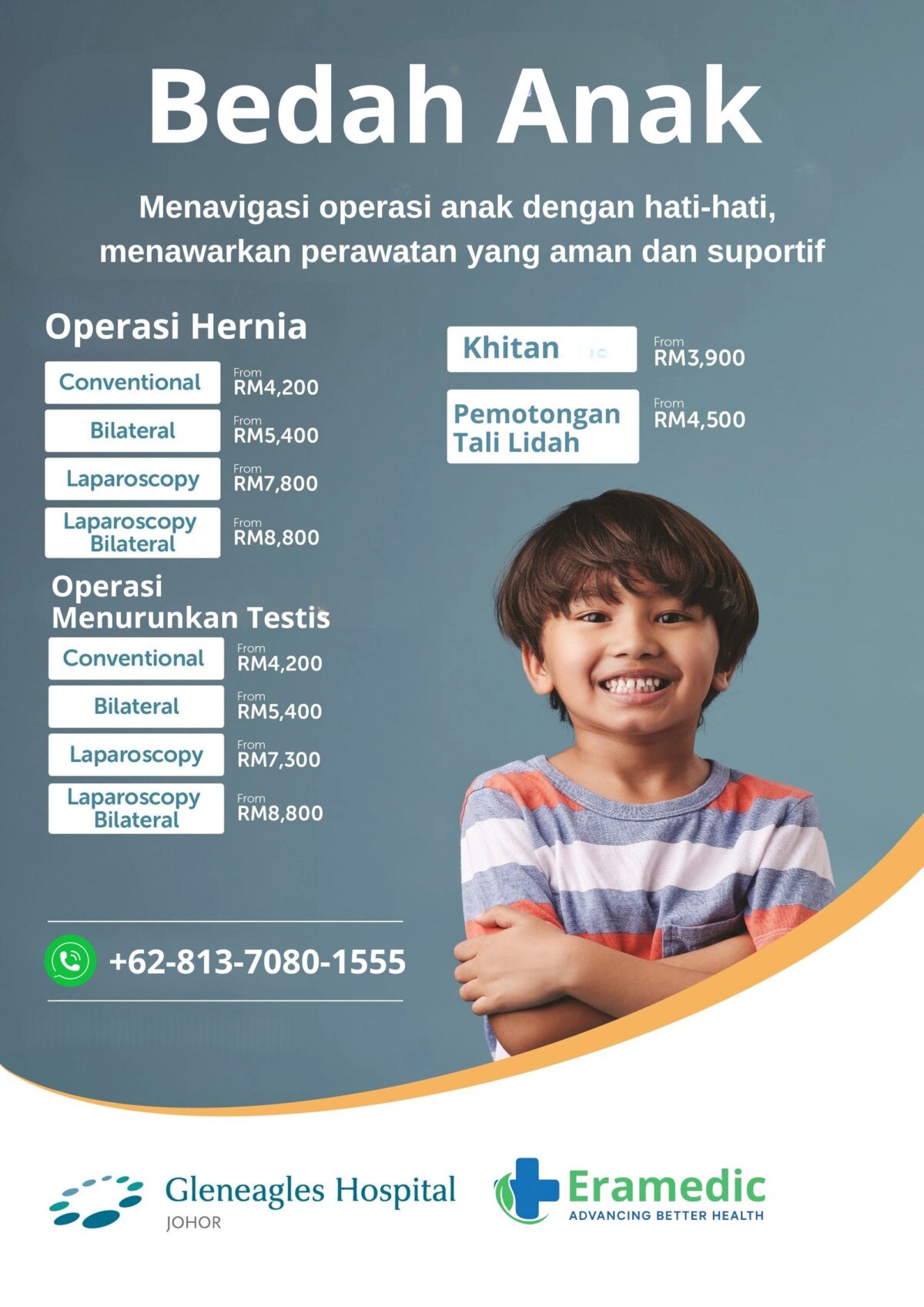 Untuk mempermudah keluarga dalam mendapatkan perawatan terbaik, Gleneagles Hospital Johor menghadirkan paket bedah anak yang lengkap dan terjangkau. Paket ini mencakup berbagai prosedur penting seperti: